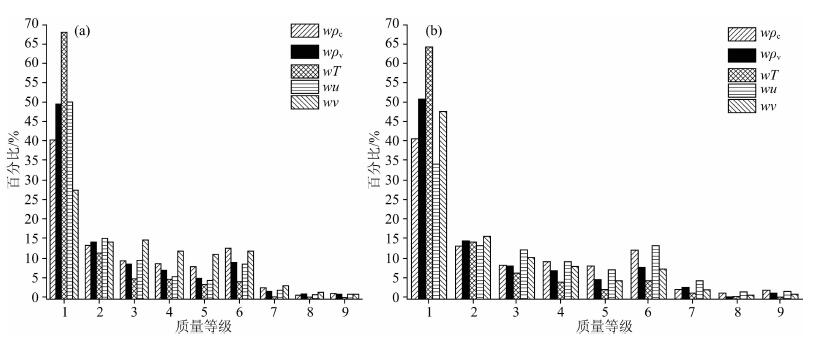 图 5 两种坐标旋转方法的SST质量等级频率分布 (a) DR; (b) PF. Fig. 5 Frequency distributions of quality level for steady state with different coordinate corrections |