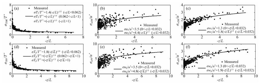 图 6 不稳定条件下T、u、w的无量纲标准差与大气稳定度z/L在(a,b,c)DR和(d,e,f)PF两种坐标旋转方法下的相似性关系 Fig. 6 Standard deviations of temperature normalized by T* , and horizontal (u) , vertical velocity (w) normalized by u* as a function of stability (z/L) under unstable stratifications of DR (a,b,c) and PF (d,e,f) |