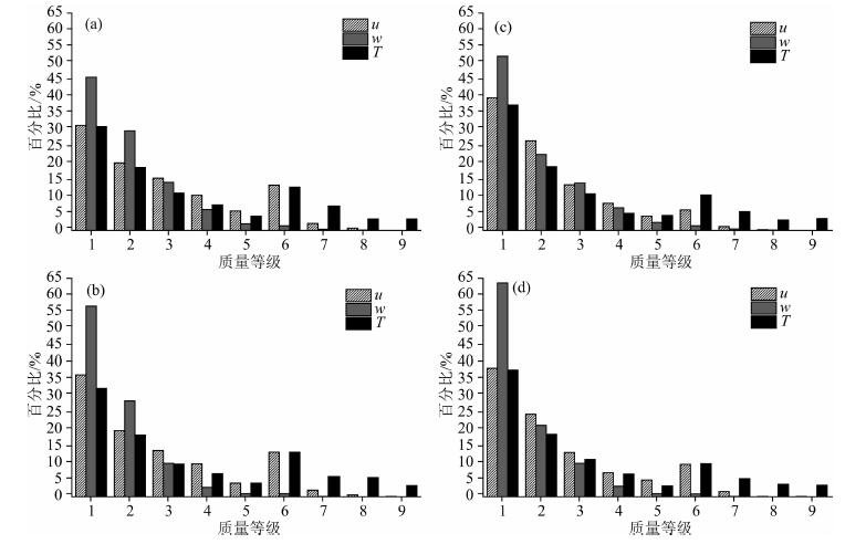 将资料进行湍流平稳性检验和ITC检验是为了筛选出高质量数据,以用于进一步的研究.为了方便使用,Lee等(2005)提出了一套总体质量的划分方法,见表 4.质量等级为1~3的为高质量数据,可用于基本研究,例如参数化方案的发展;质量等级为4~6的为中等质量数据,可用于长期观测资料处理;质量等级为7~9的为低质量数据,应舍弃,必要时对缺失数据做插补.