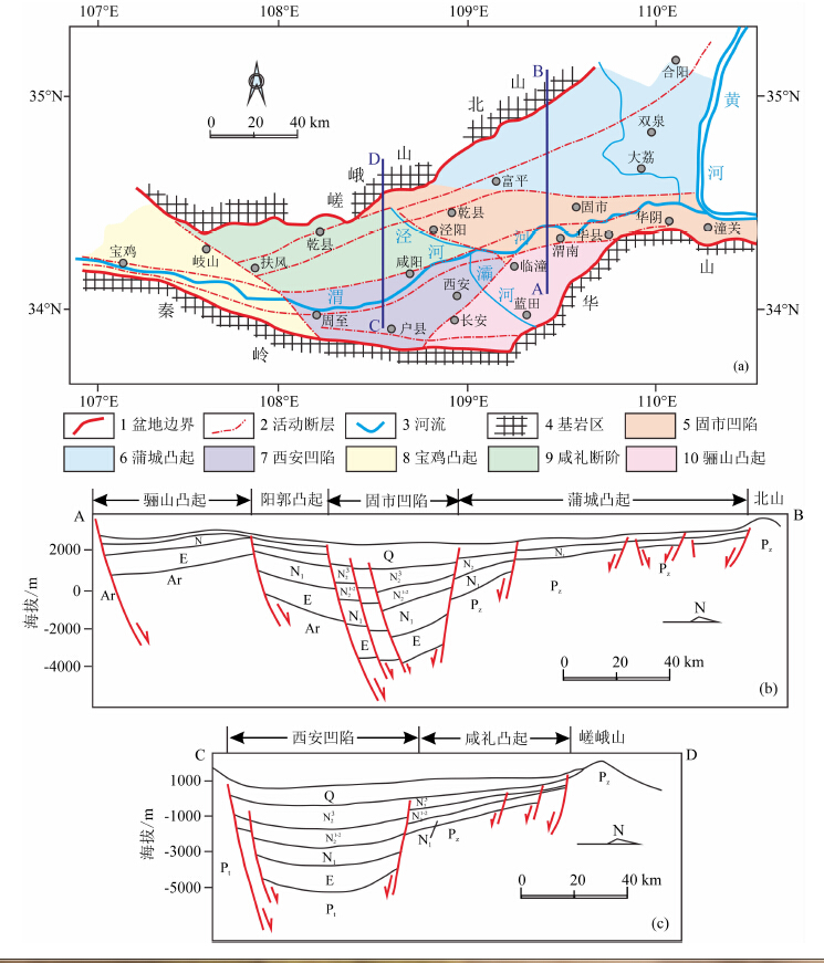 图 1 渭河盆地区域构造与内部大断裂(a)及构造剖面(b、c) Fig. 1 Regional structure, main faults (a) and structural sections (b, c) of Weihe Basin |