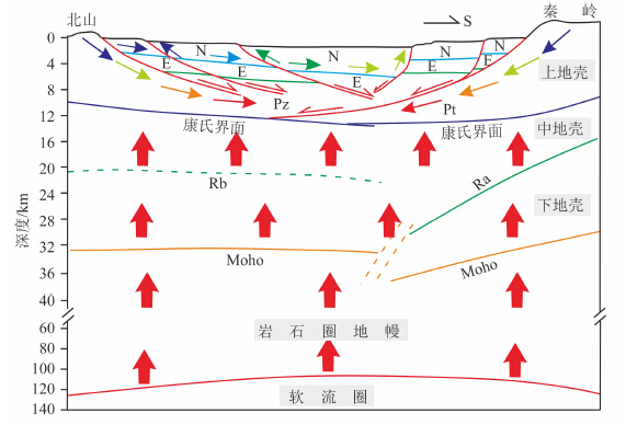 多种地球物理探测资料(张少泉等,1985;Xu and Ma, 1992;Xu et al., 1993;Pan and Niu, 2011;任隽等,2012;Bao et al., 2013;王谦身等,2013;滕吉文等,2014;Wang et al., 2014)表明,渭河盆地坳陷区沉积盖层较厚,结晶基底埋藏深,达6~8 km,沉积盖层和中、上地壳速度低,下地壳速度高,莫霍界面剧烈上隆,并与结晶基底大致呈镜像关系,与鄂尔多斯台地相比,上隆幅度达10 km左右,形成莫霍界面突变带,与秦岭褶皱带相比,上隆幅度约4 km,莫霍界面为渐变带.