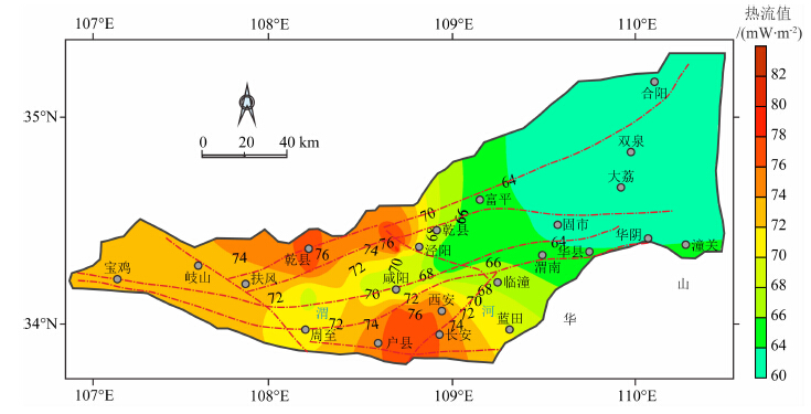 图 2 渭河盆地大地热流等值线图 Fig. 2 The heat flow pattern of the Weihe basin |