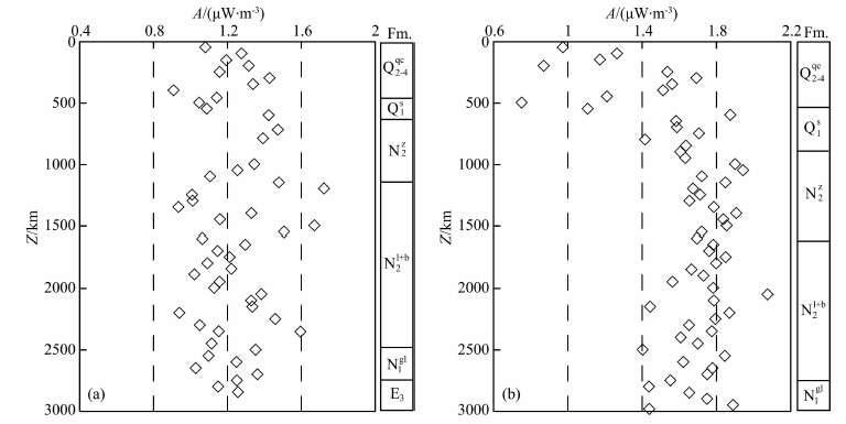图 3 文热8(a)和地中海1井(b)沉积层生热率随深度的变化 Fig. 3 The change of heat production rate of sediments with depth of Well Wr8 (a) and Dzh1 (b) |
