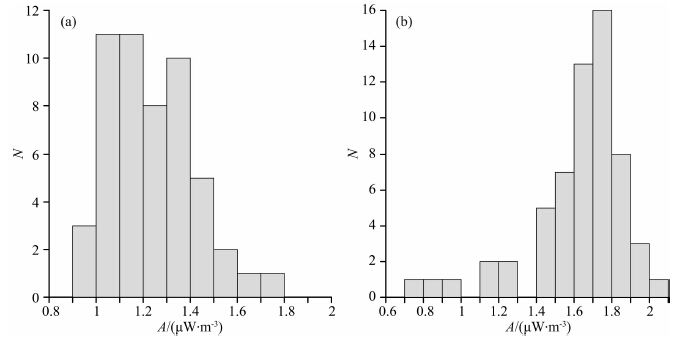 图 4 文热8(a)和地中海1井(b)沉积层生热率统计直方图 Fig. 4 The sediment heat generation rate histogram of Well Wr8 (a) and Dzh1 (b) |