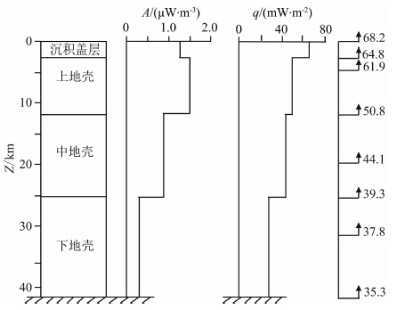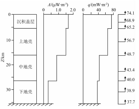 研究中,生热率A采用分层阶状函数模型,对于沉积盖层、上地壳和岩石圈地幔部分,不考虑热导率K的温度效应,则