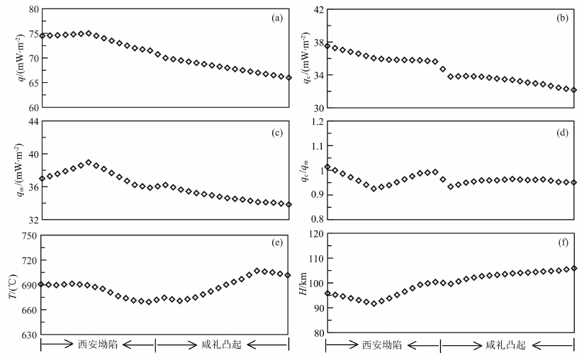 图 7 渭河盆地西安坳陷—咸礼凸起岩石圈热结构剖面 (a) 大热热流; (b) 地壳热流; (c) 地幔热流; (d) 壳/幔热流比值; (e) Moho面温度; (f) “热”岩石圈厚度. Fig. 7 The thermal structure profile along Xi′an Depression and Xianli Uplift in Weihe Basin (a), (b), (c), (d), (e), (f) are the heat flow, crustal heat flow, mantle heat flow, the proportion of crustal heat flow and mantle heat flow, Moho surface temperature and thermal lithospheric thickness. |