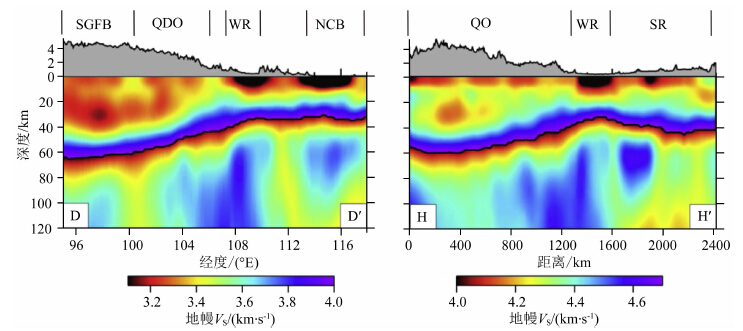 图 8 渭河盆地剪切波层析成像结果(据Bao et al., 2013) SGFB:松潘甘孜褶皱带;QDO:秦岭—大别造山带;WR:渭河裂谷盆地;NCB:华北盆地;QO:祁连造山带;SR:山西裂谷系. Fig. 8 Cross-sections of shear wave velocities along DD′ and HH′ profiles (from Bao et al., 2013) The abbreviation are Songpan-Ganzi Fold Belt, SGFB; Qinling-Dabie Orogen, QDB; Weihe Rift, WR; North China Basin, NCB; Qilian Qrogen, QO; Shanxi Rift, SR. |