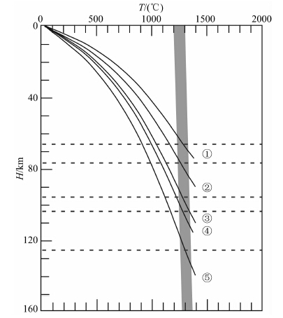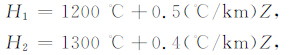 本文采用Artemieva和Mooney(2001)提出的如下两条绝热线来定义“热”岩石圈厚度的上、下界,二者的中值为研究区“热”岩石圈厚度: