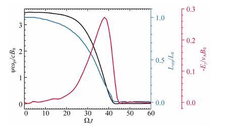 图 1 磁岛中心O点和合并点X之间的磁通量差值ψωpi/cB0(黑线),两磁岛中心O点的距离Lsep/L0(蓝线,其中L0为初始距离),重联率- Ey/vAB0(红线) 随时间的演化 Fig. 1 The time evolution of the magnetic flux difference between the X and O points ψωpi/cB0(the black line),the distance between the two island O points Lsep/L0(the blue line,where L0 is the initial distance),and the reconnection rate -Ey/vAB0(the red line) |