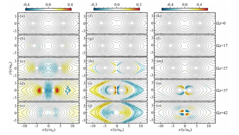 图 2 面外电场Ey/vAB0(a—e),面内极化电场Ex/vAB0(f—j),面外磁场By/B0(k—o)随时间的演化,实线为磁力线 Fig. 2 The time evolution of the out-of-plane electric field Ey/vAB0(a—e),the electric field in the x direction Ex/vAB0(f—j),and the out-of-plane magnetic field By/B0(k—o)at Ωit=0,17,27,37 and 42. The in-plane magnetic field lines are also represented |