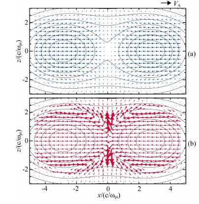 图 3 离子(a)和电子(b)的流场分布,实线为磁力线,Ωit=35 Fig. 3 The flow pattern of the ions(a)and electrons(b)at Ωit=35. The in-plane magnetic field lines are also represented for reference |