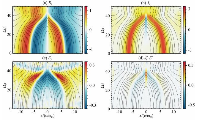 图 4 z=0剖线上(a)z方向磁场Bz/B0,(b)y方向总电流密度Jy/en0vA,(c)y方向电场Ey/vAB0,(d)电子流体参考系下的电子电流密度和电场的点积Je* · E*随时间的演化,实线为磁力线 Fig. 4 The time evolution of(a)the magnetic field in the z direction Bz/B0,(b)the total out-of-plane current density Jy/en0vA,(c)the out-of-plane electric field Ey/vAB0,(d)the dot product of the electron current density and theelectric field in the electron frame Je* · E* along the cut z=0. The in-plane magnetic field lines are also represented |