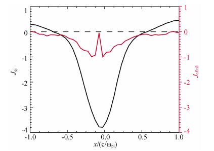 图 5 z=0剖线上y方向电子电流密度Jey/en0vA(黑线)和漂移电子电流密度eneEx/Bz(红线)沿x方向的分布,Ωit=39 Fig. 5 The profiles of the electron out-of-plane currentJey/en0vA(the black line)and the electron drift current eneEx/Bz(the red line)along the cut z=0 at Ωit=39 |
