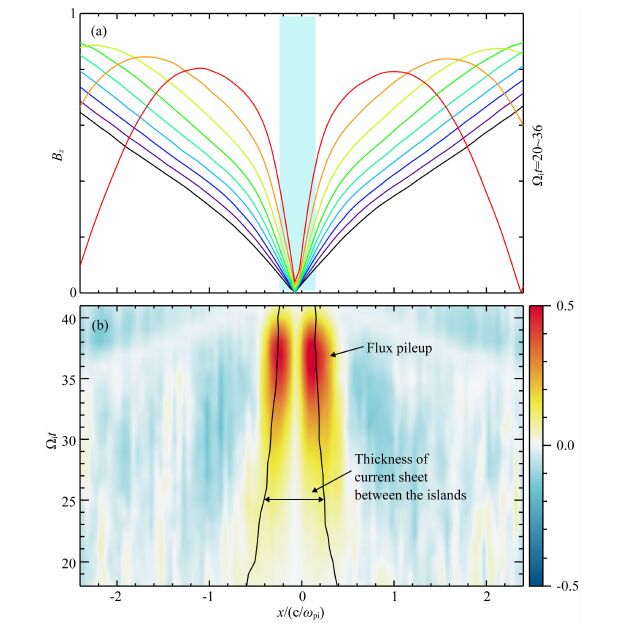 图 6 z=0剖线上(a)z方向磁场 Bz/B0 在不同时刻的分布,Ωit=20,22,24,26,28,30,32,34,36(颜色从黑到红), 蓝色阴影部分为Ωit=39时的电流片宽度,(b)dBz/dt(其中d/dt为电子流体坐标系下的随体导数)和电流片宽度随时间的演化 Fig. 6 The demonstration of magnetic flux pileup.(a)Cuts of the magnetic field Bz/B0 in the z direction along z=0 at Ωit=20,22,24,26,28,30,32,34,36(the colors from the black to the red),the thickness of the current sheet in the x direction at Ωit=39 is also presented(the blue shadow).(b)The time evolution of dBz/dt(here d/dt is the material derivative in the electron frame)and the thicknessof current sheet from Ωit=18 to Ωit=41 along the cut z=0 |