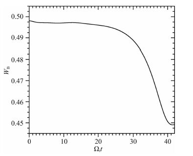 图 7 系统磁场能量随时间的演化,其中WB=∫B2dxdz/(B02LxLz) Fig. 7 Time evolution of magnetic field energy,which is calculated by WB=∫B2dxdz/(B02LxLz) |