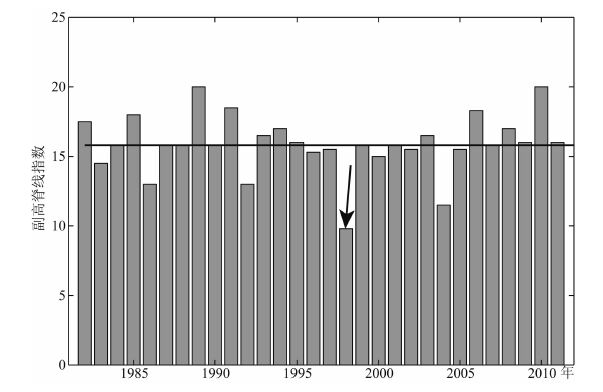 图 1 1982到2011年夏半年(5月至10月)的副高脊线指数分布图 Fig. 1 The area index of summer half-year(from May to October)from 1982 to 2011 |