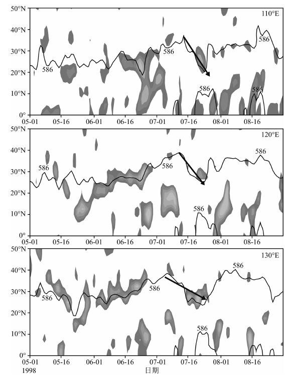 图 3 1998年5—8月逐日沿110°E、120°E和130°E 586特征线纬度-时间剖面 阴影区表示OLR距平≤-200 W·m-2的纬度-时间分布,表示热带强对流活动区以及对流降水区的位置. Fig. 3 The daily latitude-time section of 586 feature lines along 110 °E,120 °E and 130 °E from May 01 to August 31 in 1998 |