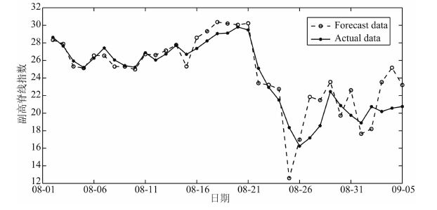 对实际预测效果进行检验,选择时段(1998-08-02—1998-09-05)的副高脊线指数的时间序列来检验模型的预报效果.这里面包含了副高较易出现异常活动的8月份.
