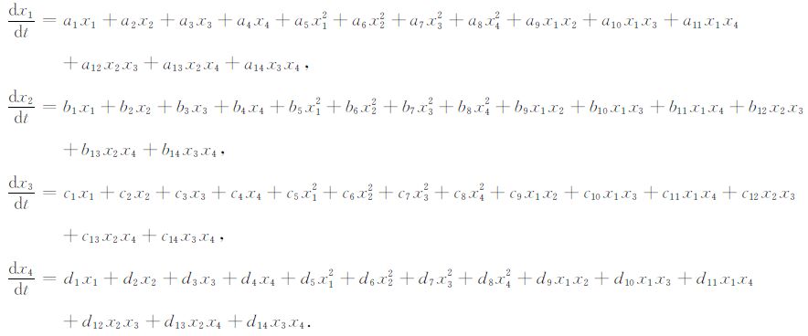 我们拟以T1,T2,T3,T4表征2.3节选定的副高脊线指数、马斯克林高压、ENSO指数和孟加拉湾经向风环流指数这四个时间序列,假设下面(4)式二阶非线性常微分方程组作为拟重构反演动力学模型,副高脊线指数、马斯克林高压、ENSO指数和孟加拉湾经向风环流指数这四个因子选择都是1982年到2011年30年平均5月1日到10月31日的数据.四个时间序列的总长都是184天.将这四个时间序列作为模型输出的“期望数据”,从而进行模型参数的反演与优化.