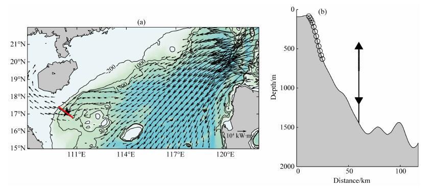 图 1 (a)由TPXO中国近海正压潮汐模型所得南海北部正压潮能通量(蛋青色底色和黑色等值线代表水深,黑色五角星表示潜标系统位置),(b)包括潜标配置的跨陆坡截面(图 1a中红色直线)地形(空心圆圈表示海底全日临界和超临界地形) Fig. 1 (a)Barotropic tidal energy flux derived from the TPXO global tidal solution in the Northern South China Sea with bathymetry represented by cyan and black contours. The mooring location is indicated by the black star.(b)Schematic topography crossing mooring location with designed depths of ADCP and CTs. Critical and super-critical diurnal slopes at seabed are indicated by open circles |