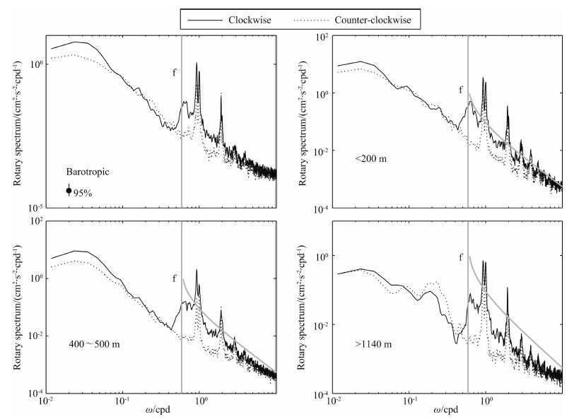 图 2 水平流速旋转谱于不同深度的垂向平均(实线为顺时针分量,虚线为逆时针分量,灰色虚线是Garret-Munk75内波谱) Fig. 2 Vertically averaged rotary spectra at different depths. Solid line is clockwise component. Dashed line is counter-clockwise component. Gray solid line is GM75 internal wave spectrum |