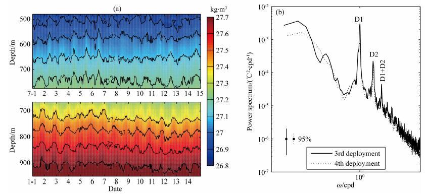 图 3 第三段和第四段布放期间(a)温盐链观测的等密度面深度时间变化序列,(b)垂向平均的功率谱 Fig. 3 (a)Potential density from CTs-chains over a period of 15 days in third and fourth deployments,(b)Vertically averaged power spectra of potential density |