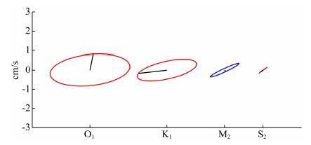 图 4 正压分潮流椭圆(红色为顺时针旋转潮流矢量,蓝色代表逆时针旋转,椭圆内黑线与长轴夹角表示格林威治迟角) Fig. 4 Barotropic tidal ellipses of O1,K1,M2 and S2. Red ellipses indicate the tip of the tidal current vector rotating clockwise. Blue one refers to counterclockwise rotation. The angle between black lines in the ellipses and major axes denote phase lag with respect to Greenwich Time |