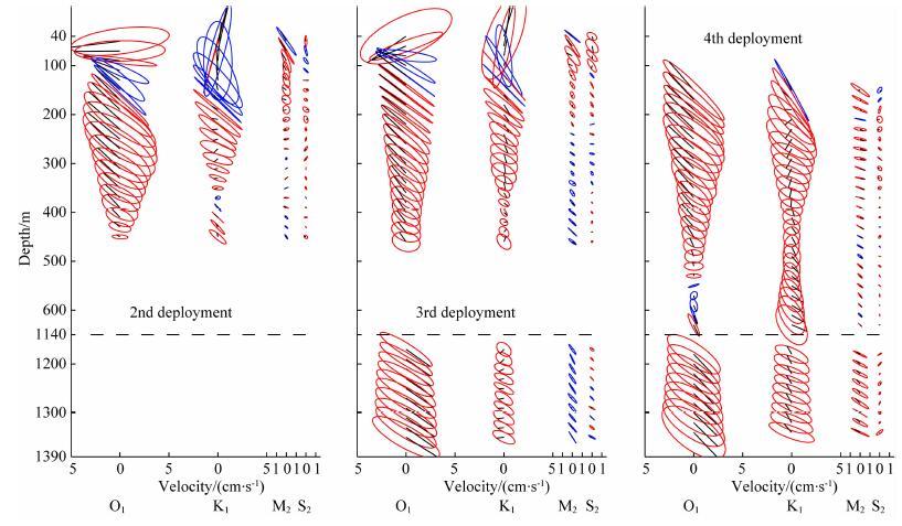 图 5 第二、三和四段观测期间四个主要分潮的内潮流椭圆垂向分布 Fig. 5 Internal tidal ellipses for four major constituents in second,third and fourth deployments |