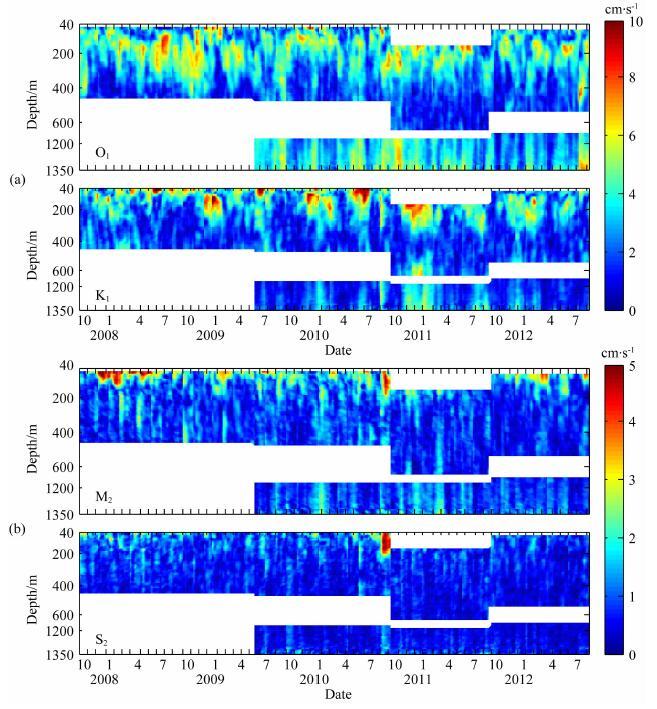 对后三段观测,从实测海流中减去正压海流即为斜压海流,再分别进行调和分析便可将内潮流分离出来.由于在前两段观测中,缺少深层的海流记录,本文利用3.2节得到的正压潮流椭圆参数回报前两段观测时期的正压潮流,然后对扣除该正压潮流的实测海流做调和分析以得到前两段观测期间的斜压潮流.图 5仅列出第二、三和四段观测期间内潮流椭圆垂向分布,以作说明.由于各段观测期长短不一(第二、三、四段观测分别长达8个月、16个月和1年),并且垂向采样深度不同,同一分潮在同一深度不同观测段的内潮流椭圆略有差异,但内潮总体垂向结构特征基本一致.全日O1和K1内潮显著大于半日内潮,代表内潮能通量传播方向的椭圆长轴倾角在观测深度范围内基本为稳定的跨陆坡方向.O1内潮表现为显著第一模态特征,海洋上层和近底层内潮流较强,在500~600 m的中层潮流最弱.K1内潮小于O1内潮,400 m左右内潮流振幅减弱至最小,向下复又增强.半日内潮流振幅较弱,100 m以下振幅小于1 cm·s-1.
