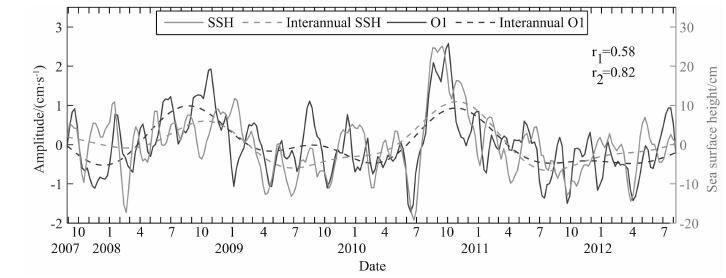 图 7为图 6a中跨陆坡方向O1内潮400m以浅垂向平均振幅(蓝色实线)与卫星观测海面高度(绿色实线)的变化关系,二者峰值在大部分时间呈很好的一一对应关系,相关系数为0.58,超过95%置信检验.尤其是2010年夏秋季,在一异常强的暖涡影 响下(Chu et al.,2014),O1内潮振幅伴随显著升高的海面高度亦有较强的增长.经360天低通滤波后(虚线),二者在年际尺度上的正相关关系更加显著,相关系数可达0.82.这说明研究海域内潮同样具有显著的低频变化特征,受上层密度场调制,其振幅在季节内及其更长时间尺度上正比于温跃层的深度或者海平面的高度.