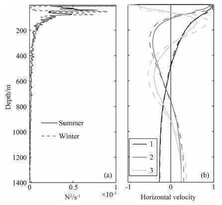 图 8 (a)观测站处冬(虚线)、夏季(实线)层结垂向分布以及(b)前三个斜压水平速度垂向动力模态(这里为 了更好的显示模态的垂向结构根据各个模态的最大振 幅已做标准化处理) Fig. 8 (a)Vertical profile of square Brunt-Visl frequency calculated from cumulative CTD casts,(b)First three normalized baroclinic modes for horizontal velocity |