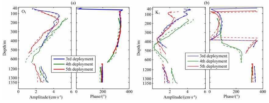 图 9 (a)由零阶模和前四个斜压模重构得到的O1和(b)K1分潮的振幅和相位廓线(实线表示实际观测的分潮流振幅和相位廓线,虚线代表重构所得) Fig. 9 Reconstruction of amplitude and phase of the O1(a)and K1(b)tidal constituents(dashed lines)from combination of barotropic and first four baroclinic modes separately from third,fourth and fifth deployments. Real profiles of tidal current are displayed by solid lines |