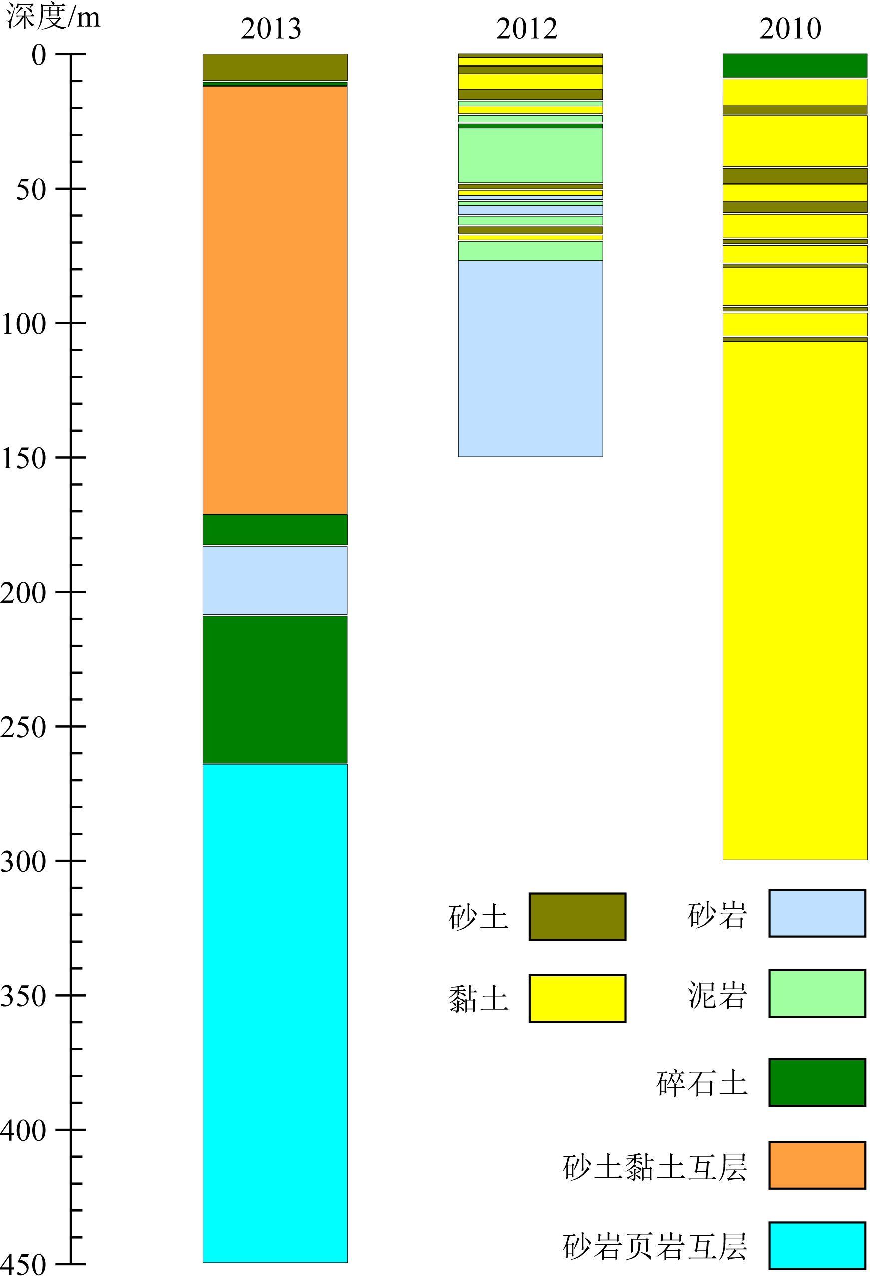 3个钻孔的成孔深度分别是300 m(2010年)、150 m(2012年) 和450 m(2013年).根据所取得的资料显示,这3个钻孔所在的位置,其多年冻土厚度分别是110.2 m(2010年)、47.5 m(2012年) 和82.15 m(2013年);3个钻孔都穿透了多年冻土层.钻孔岩芯显示地层主要以粘土、砂土、碎石土、砂岩和页岩为主.具体的钻孔信息如表 1所示,3个钻孔的岩芯示意图,如图 2所示.