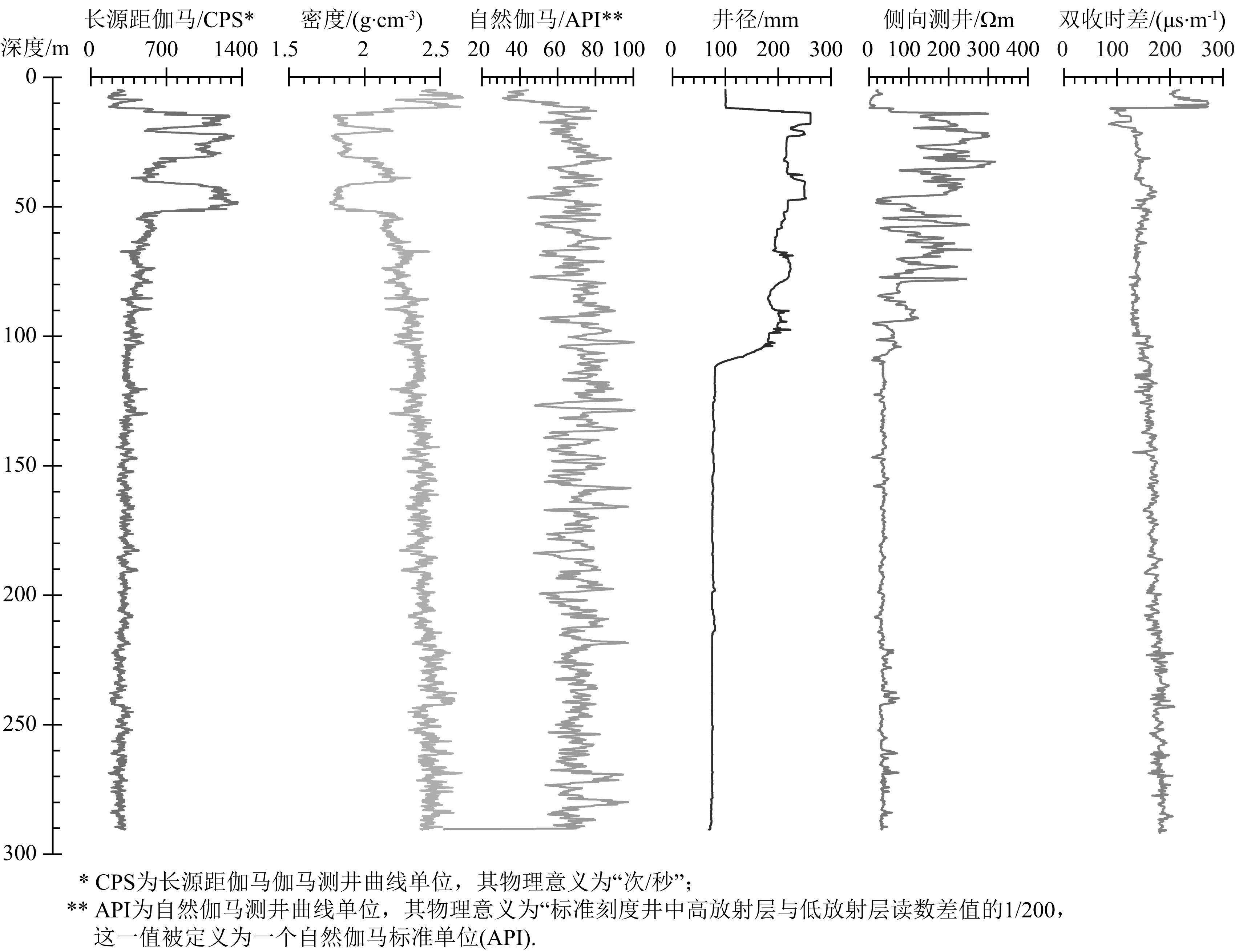 对于泥岩和砂岩来说,冻结或非冻结状态下其物理性质差异不大.尽管钻探过程中的热扰动对冻结的泥岩或砂岩会有影响,导致冻结基岩融化,但因为基岩本身力学性质较为稳定,因而其井径变化较小.对于侧向测井来说,因为基岩本身致密而含水率较小,使得其在冻结和非冻结状态下的电阻率差异较小;因此对于基岩来说,井径和侧向测井曲线无论在冻土层或是非冻土层中,其变化都不大,并不能很准确地指示多年冻土厚度.