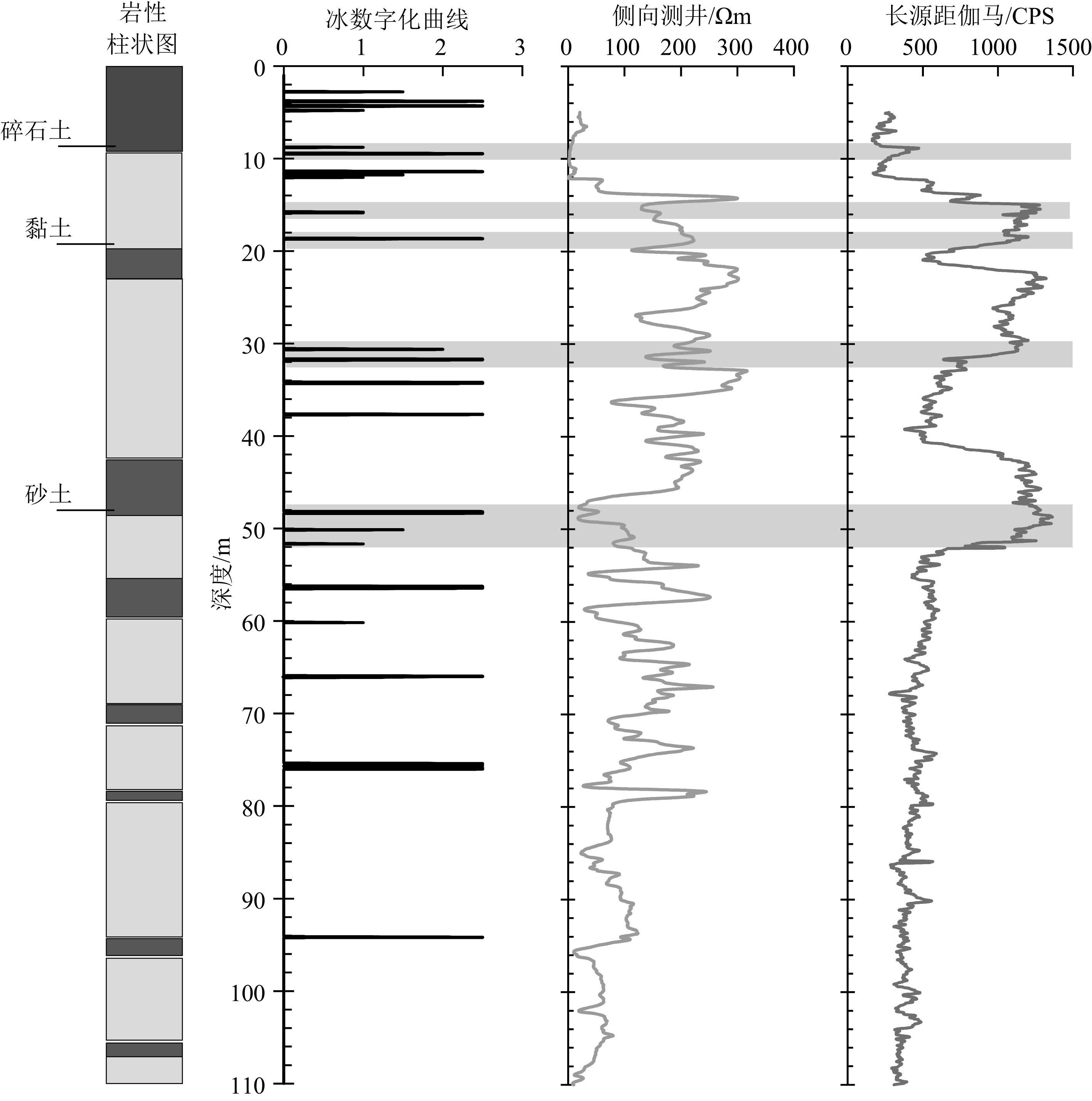 5.2 多年冻土层内地下冰层与测井曲线的关系侧向测井曲线反映的是土层中的电阻率情况.冰的电阻率一般为500 kΩm(Makogon,1988) 左右,因此,含有冰或冰层多年冻土电阻率较大.侧向测井对多年冻土层中的冰透镜体或冰层具有较好的响应.长源距伽马-伽马曲线数值代表井下伽马源发出的伽马射线被地层吸收后的计数率(CPS),密度大的地层,对伽马射线吸收强烈,故计数率低;反之,密度小的地层则计数率高.粘土的平均密度为1.8~2.0 g·cm-3,冰的密度一般为1 g·cm-3左右,因此,含有冰层的地层密度,相对来说要小于不含有冰层的地层密度.