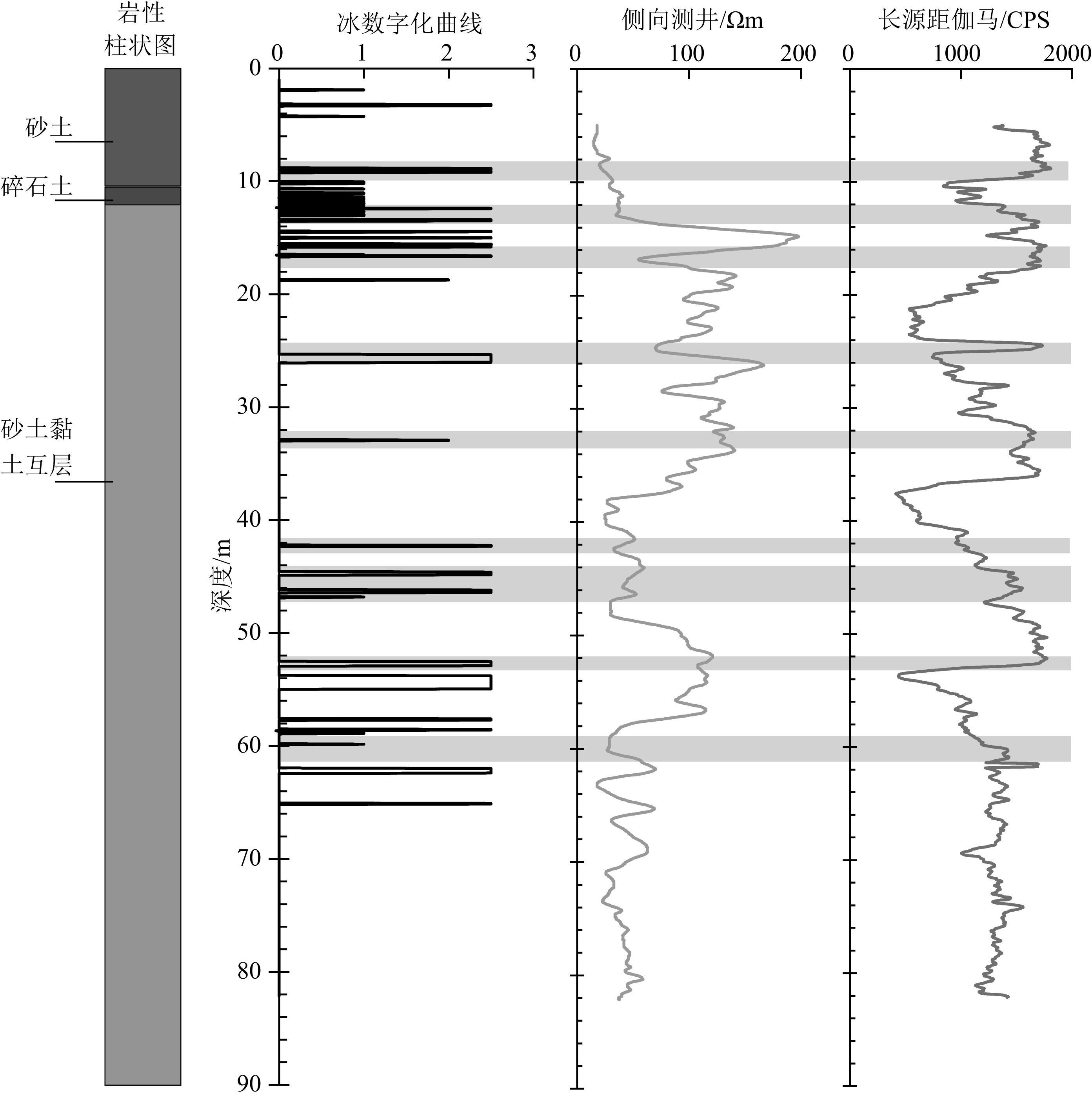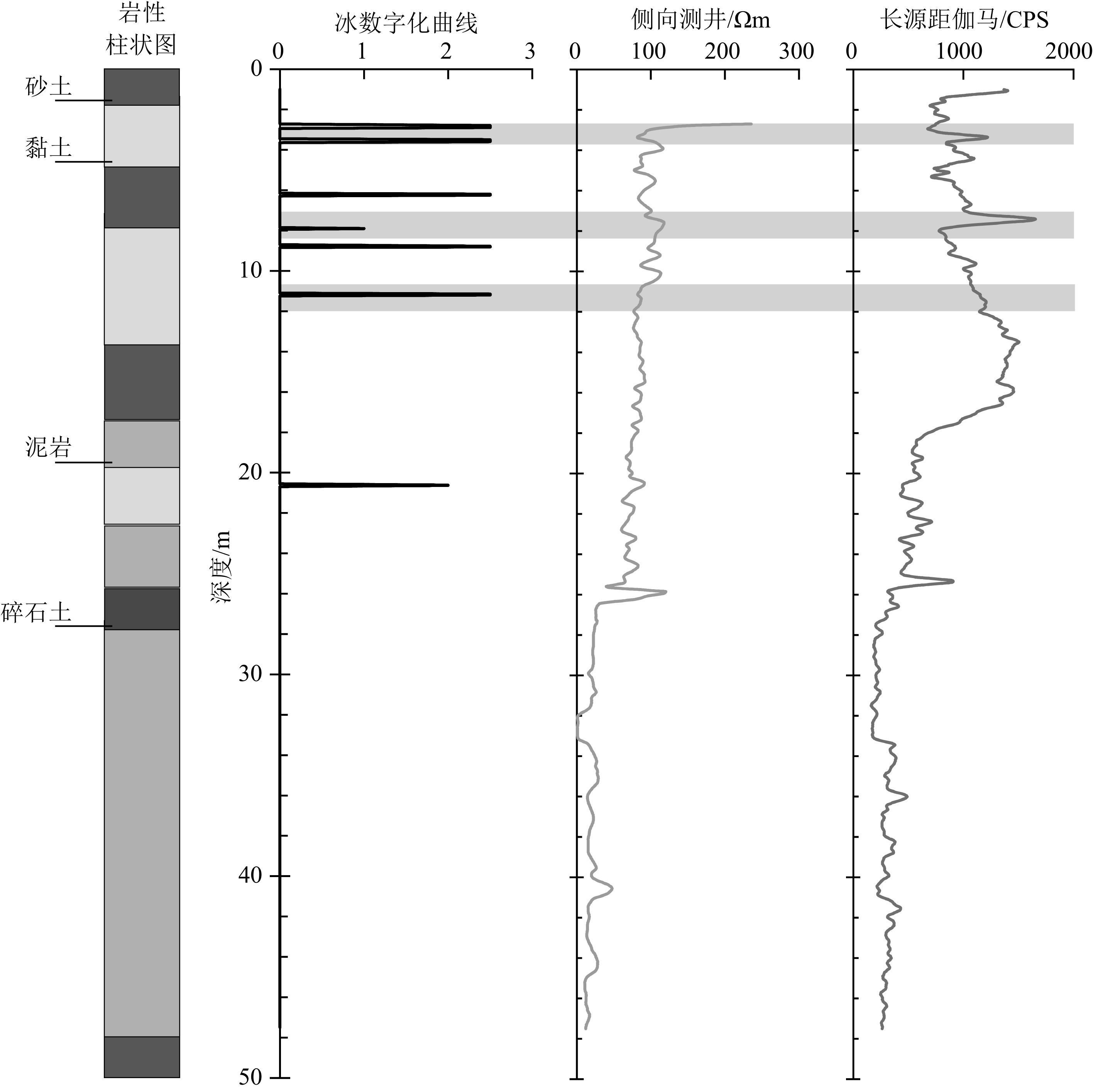 我们认为,侧向测井曲线和长短源距伽马-伽马曲线这两种测井曲线,在测井采样率为5 cm的情况下,可以定性化指示冻土层内明显的、厚度相对较大的冰层,或厚度较小但连续出现的冰层的存在,但分散的,厚度相对较小的冰层,则并不能通过这两种测井曲线来准确反映.